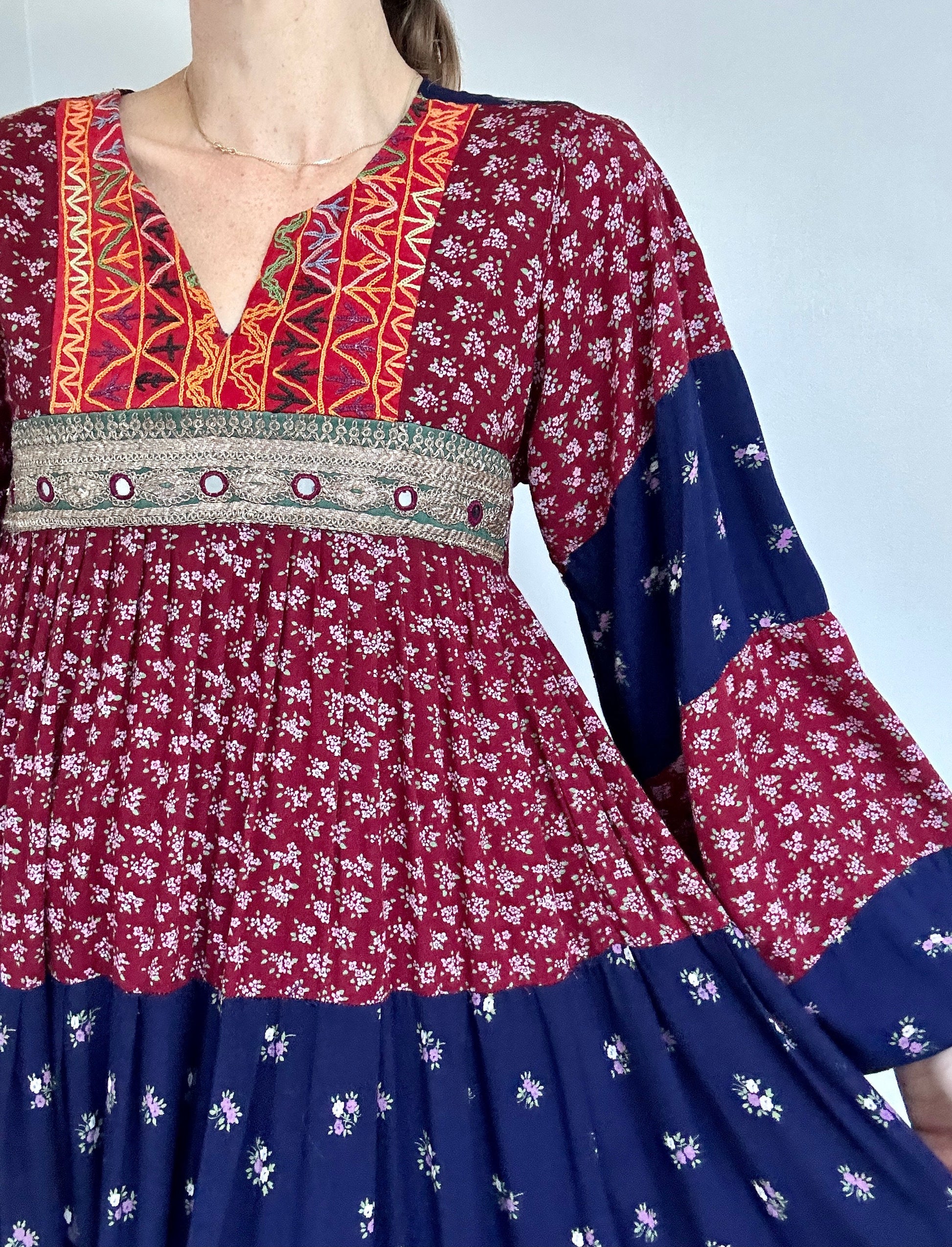 Dreamiest 70s balloon sleeve bohemian patchwork dress. Feels like cotton, with empire waist and tiered skirt. Mirror work and embroidered at bodice.